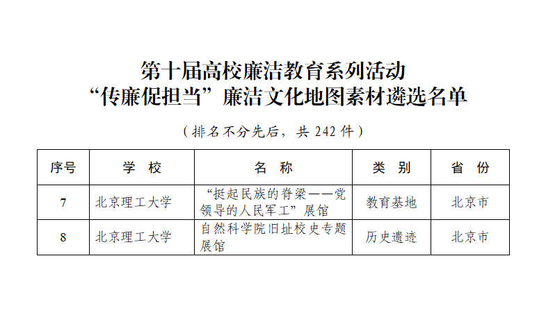 近日,教育部正式公布第十届高校廉洁教育系列活动结果。北京理工大学推荐的2项廉洁文化地图素材:“挺起民族的脊梁——党领导的人民军工”展馆、自然科学院旧址校史专题展馆(延安),从全国众多作品中脱颖而出,成功入选“传廉促担当”廉洁文化地图素材优秀作品名单。